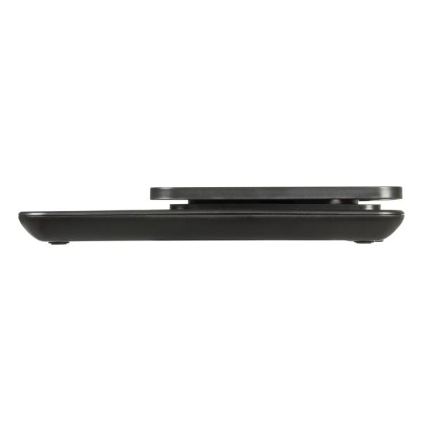 Dankzij de praktische tarra-functie kun je meerdere ingrediënten in één kom wegen zonder tussendoor te moeten rekenen. De licht verhoogde rand van het plateau voorkomt dat losse ingrediënten zoals tomaatjes of bessen wegrollen. Met de verlichte LCD-display lees je de waarden duidelijk af, zelfs bij minder goed licht.