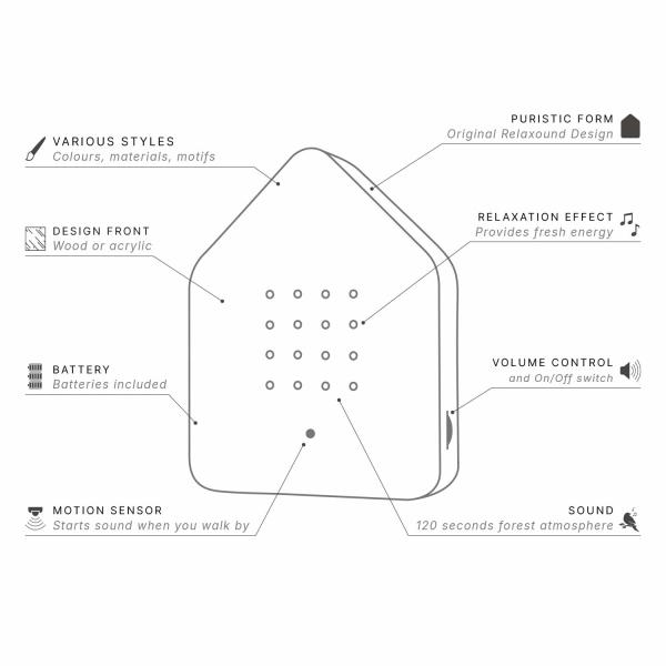 Met de Relaxound Zwitscherbox creëer je kostbare momenten van ontspanning. De rustgevende natuurgeluiden nemen je mee naar een ochtendbos, waar het vrolijke getsjilp van merels en andere zangvogels je direct tot rust brengt. Je merkt hoe je lichaam en geest ontspannen en je gedachten opklaren.