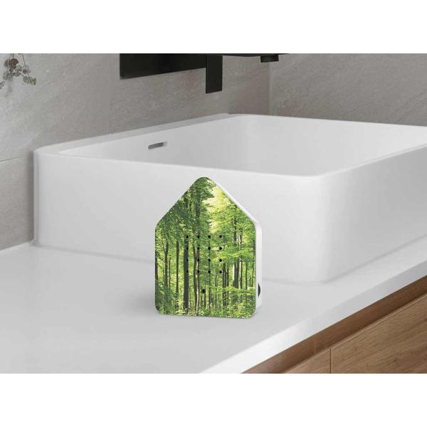 Dankzij het designfront met een prachtig ochtendbos past deze tjilpende box perfect in elke omgeving.