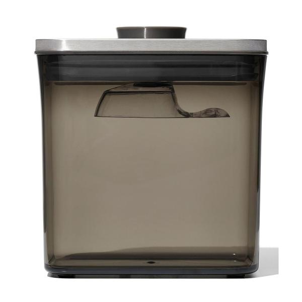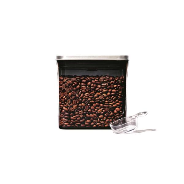 Deze voorraadbus 'POP SteeL' van OXO Good Grips is perfect voor het bewaren van een pond koffie(bonen). Hij is voorzien van een UV-filter, voor een optimale conservering van koffie, en wordt bovendien geleverd met een schep van 30 ml dat je onder het deksel bevestigt, zodat je hem altijd bij de hand hebt wanneer je koffie wilt zetten. Met de grote drukknop op de bovenzijde open en sluit je de voorraadbus met één hand. De knop zorgt voor een luchtdichte afsluiting en dient bovendien als handvat om het deksel van de doos te nemen. Dankzij de afgeronde hoeken schenk je de inhoud er gemakkelijk uit.