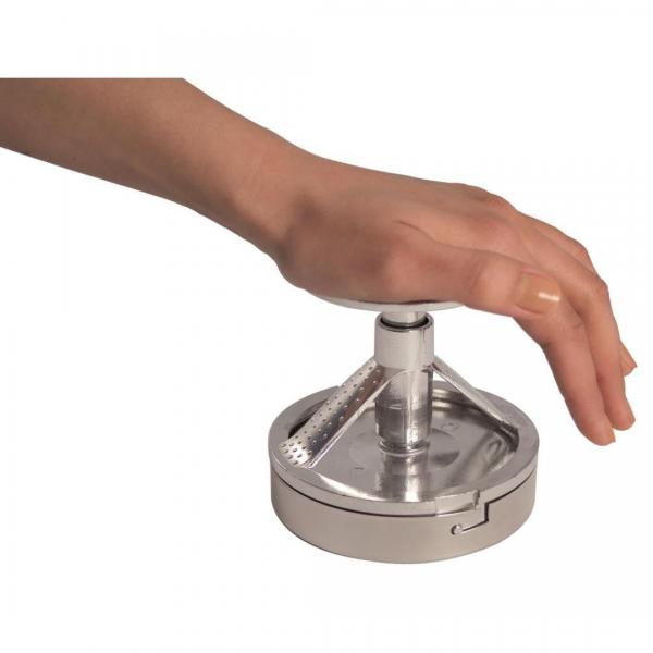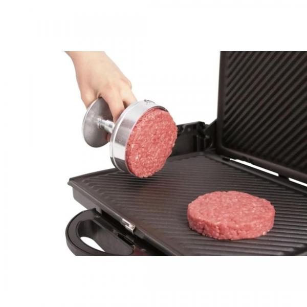 - Handvat met veer om gehaktmengsel aan te drukken; en hamburger los te drukken.
