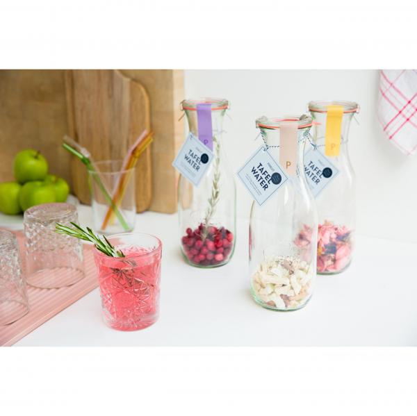 Een mooie herbruikbare karaf gevuld met een fruit & bloemen mix om een heerlijk dorstlessend tafelwater te maken. Voor in de zomermaanden een leuk en origineel cadeau.