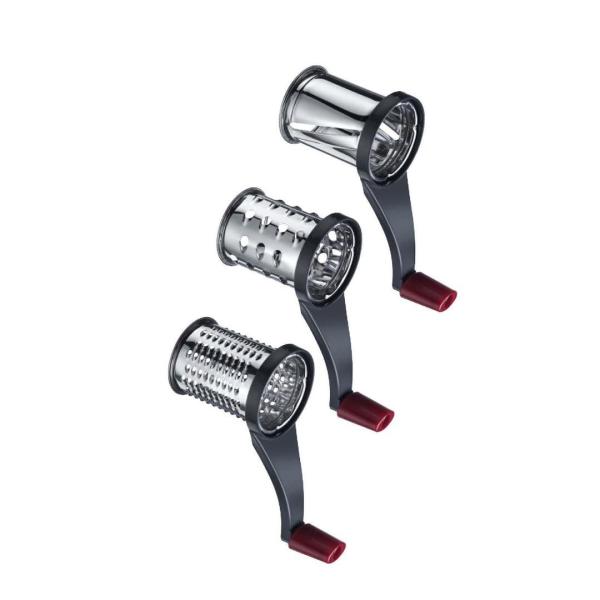 Deze raspmolen 'Trio' van Westmark is handig voor het raspen en snijden van amandelen, noten, chocolade, fruit, groenten, kaas en meer. De rasp heeft drie verschillende trommels - grof, fijn en snijden - deze wissel je eenvoudig. Het werkt eenvoudig: plaats het raspwaar in de vulopening, sluit de greep en draai de handel. Door de greep in te knijpen, druk je het raspwaar steeds aan. De raspmolen - gemaakt van kunststof met roestvrij stalen trommels - is geschikt voor zowel links- als rechtshandigen omdat je de trommels van beide kanten in de molen kunt steken. Na gebruik kun de de molen eenvoudig uit elkaar halen en mogen de delen in de vaatwasmachine.