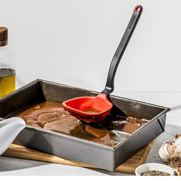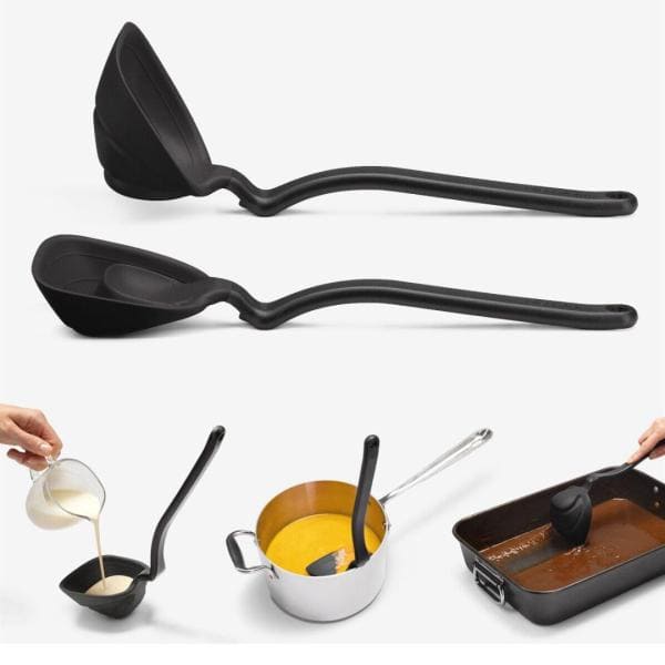 De Dreamfarm Fladle is een soeplepel die méér kan dan alleen opscheppen. De naam Fladle komt van fold flat-scraping ladle: een soeplepel die plat kan worden gevouwen en perfect schraapt. Dankzij dit slimme ontwerp berg je hem gemakkelijk op in je keukenlade en gebruik je hem zonder gedoe tijdens het koken. De flexibele siliconen rand zorgt ervoor dat je geen druppel soep of saus verspilt en eenvoudig langs de pan kunt schrapen. Extra handig is de ingebouwde maatverdeling (¼ cup en ½ cup) en de slimme handgreep waarmee je de lepel op de rand van de pan laat rusten, zodat je aanrecht schoon blijft.