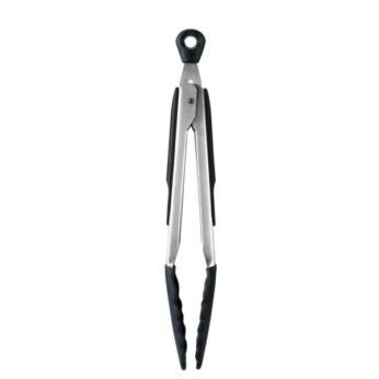 Deze serveertang van OXO Good Grips is perfect voor het keren en serveren van vlees, groenten en meer. Dankzij de hittebestendige siliconen koppen is de serveertang veilig voor gebruik in pannen met een anti-kleef laag. De serveertang ligt prettig in de hand dankzij de zachte anti-slip grepen. Na gebruik klik je de tang eenvoudig dicht voor compact opbergen, het slot is bovendien voorzien van een uitschuiftab die je als ophangoog kunt gebruiken. De serveertang is 23 cm lang, gemaakt van geborsteld roestvrijstaal en mag na gebruik in de vaatwasmachine.