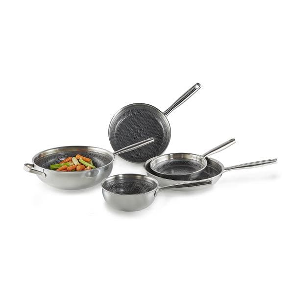 Wat deze pannen bijzonder maakt, is de unieke PFAS-vrije keramische antikleeflaag die extra versterkt is met een honingraatstructuur. Dit stalen reliëf ligt net boven de antiaanbaklaag en beschermt deze tegen krassen. Daardoor zijn de pannen duurzaam in gebruik en kun je zelfs met metalen spatels werken, al blijft het aan te raden om siliconen of houten hulpmiddelen te gebruiken. De honingraat zorgt bovendien voor een mooie verdeling van vet en warmte, wat een gelijkmatig bakresultaat geeft en helpt om ingrediënten echt krokant te bakken.
