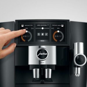 Via het Panorama Coffee Panel kunnen alle voordelen van de J8 twin intuïtief worden benut. De stringente en logische bedieningsfilosofie is volledig zelfverklarend. De Easy Mode biedt dankzij de schuifregelaars maximale flexibiliteit bij het aanpassen van de specialiteiten aan de favoriete kopjes. Assistentiesystemen maken de bediening nog eenvoudiger. De aromacontrole zorgt voor de juiste maalfijnheid. De intelligente kopjessensor, het Coffee Eye, zorgt ervoor dat de kopjes altijd in overeenstemming met de geselecteerde specialiteit onder de juiste uitloop worden geplaatst. Het spreekt voor zich dat ook reiniging en onderhoud met één druk op de knop uitgevoerd kunnen worden.